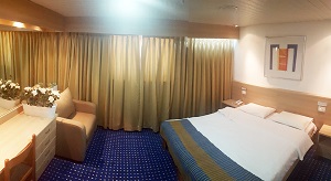 Каюта категории Сьют – двухместная внешняя каюта с окном (не открывается), с частичным видом на море, увеличенной площади со всеми удобствами (душ, туалет, умывальник).